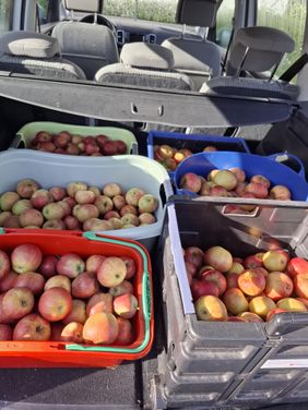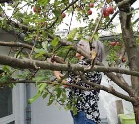 Duisburg. Eine so reiche Apfelernte hat das Malteser Hospizzentrum St. Raphael noch nie erlebt: In diesem Spätsommer bogen sich schier die Äste der zwei Bäume im Innenhof der Einrichtung. Das brachte die ehrenamtliche Mitarbeiterin Monika Ermers, die in ihrem Garten im Duisburger Süden selbst Äpfel hat, auf eine Idee: „Es wäre doch schade, wenn die Früchte einfach verfaulen würden. Warum machen wir nicht Saft aus ihnen?“ Gesagt, getan – zusammen mit ihren Kolleginnen Astrid Tenhagen und Elke Brix, beide ebenfalls ehrenamtlich im Hospiz engagiert, pflückte die 71-Jährige die Äpfel. Am Ende kamen stolze 100 Kilogramm zusammen. Die Ausbeute wäre sogar noch größer gewesen, wenn nicht Monika Ermers in den Wochen zuvor bereits aus einigen Exemplaren Apfelmus gemacht und Apfelkuchen gebacken hätte – sehr zur Freude der Patientinnen und Patienten im Hospiz.